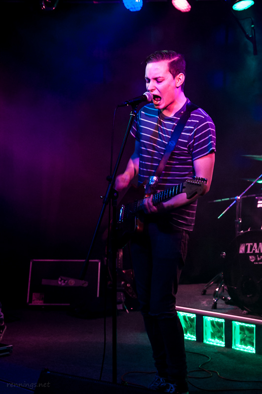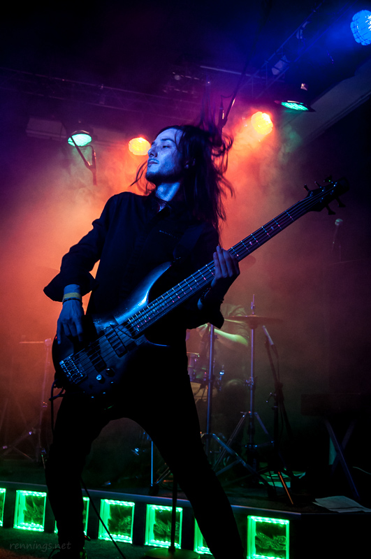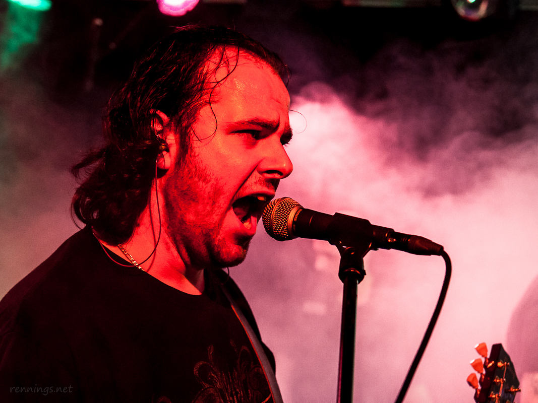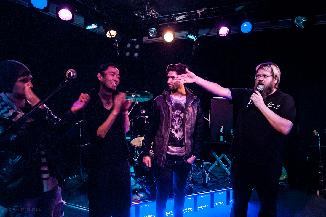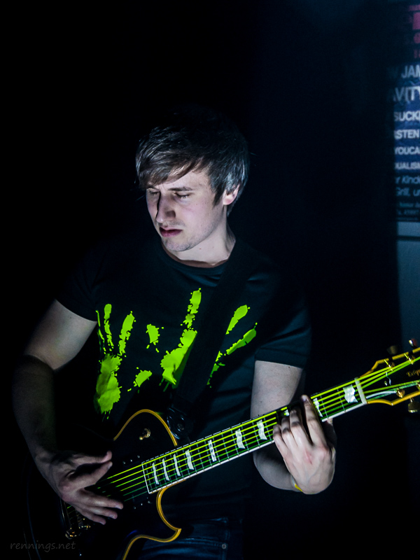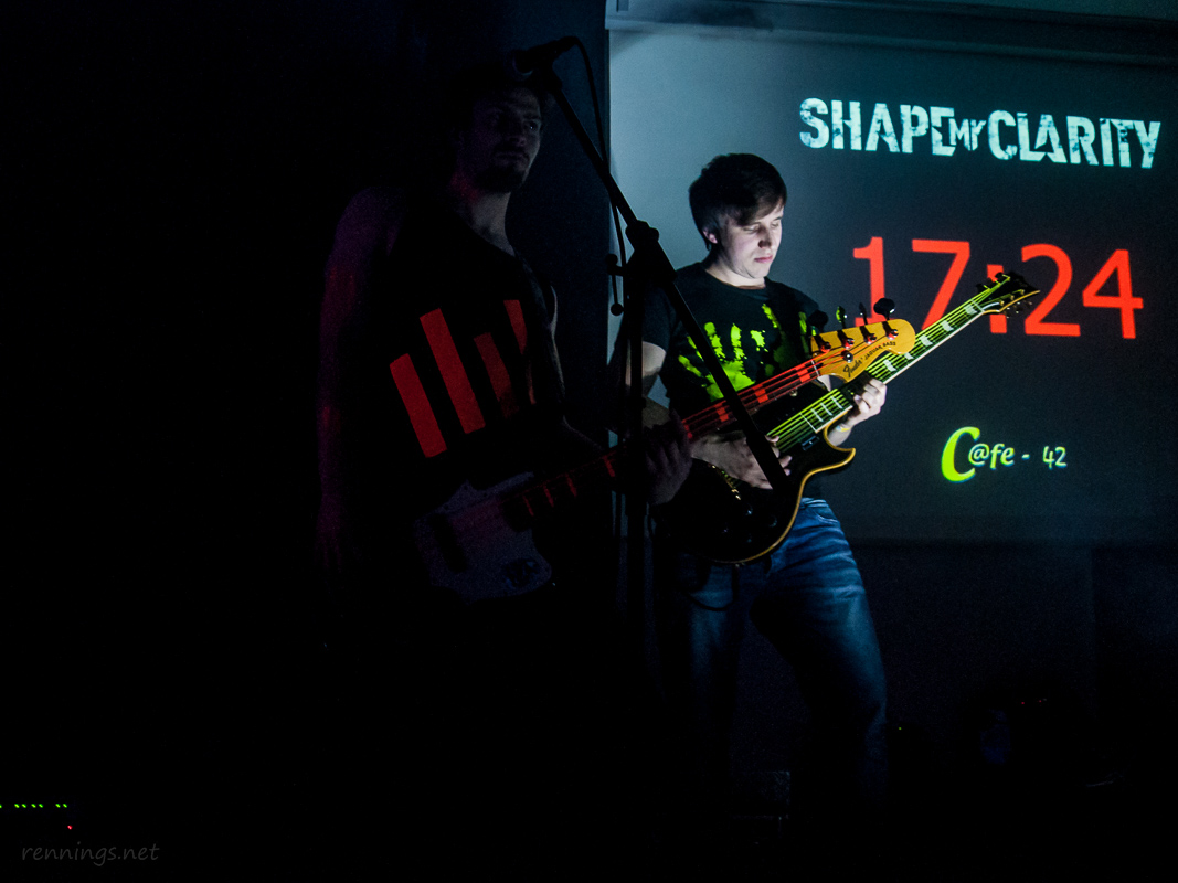 Dann kamen die ersten Battle-Teilnehmer auf die Bühne: »Shape My Clarity« aus Köln. Sie selbst nennen ihre Musikrichtung »Neon-Metal«. Sie kamen mit eigener Light-Show, so dass die Lampen vom C@fe aus blieben. Dafür hatten sie dann neben ihren Spots auch Schwarzlicht im Gepäck.