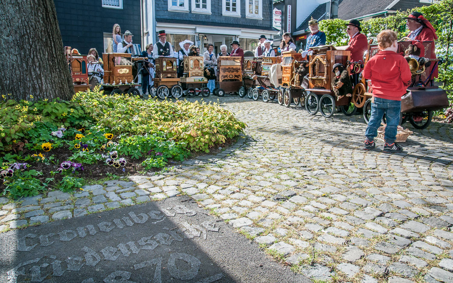 Aber ich bin doch ins Dorf gegangen. Nicht wegen des verkaufsoffenen Sonntags, sondern weil die Werbegemeinschaft WiC (Wir in Cronenberg) den »1. Cronenberger Drehorgeltag« organisiert hatte. Für einen Leierkasten wär ich auch nicht hoch ins Dorp, aber angekündigt waren mindestens zehn. Und die Ankündigung wurde eingehalten.