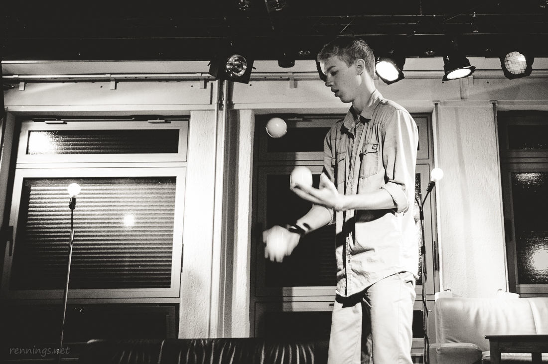 Danach trug Patrick Rausche seinen Text vor und Maximilian Rickert beendete die erste Vorrunde mit seiner Jonglage. Jonglieren ist nicht die leichteste Übung im C@fe-42, weil die Decken zwar für Konzerte und Slams ausreichend hoch sind, aber eben nicht unbedingt um Bälle und Keulen in der Luft zu halten. Aber davon hat er sich nicht abschrecken lassen und seine Sache mehr als nur gut gemacht.