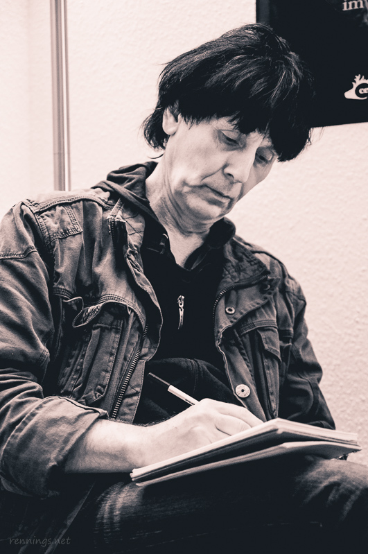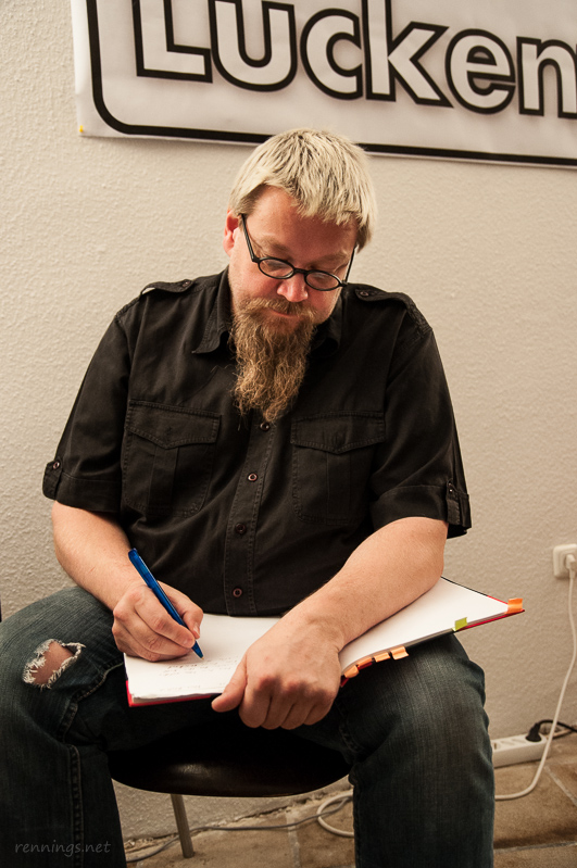 Gast war diesmal Klaus Märkert. Der Bochumer Schriftsteller und Darkwave-DJ erzählte von seinem Werdegang, seinem Leben und natürlich las er auch aus seinen Büchern. Des einen Freud’, des anderen Leid: Das Publikum freute sich natürlich über die Texte, die beiden Moderatoren hatten dabei jedoch die Aufgabe, ihre Texte zu dem (Schrottwichtel-) Gastgeschenk – einem Pinsel – zu schreiben.