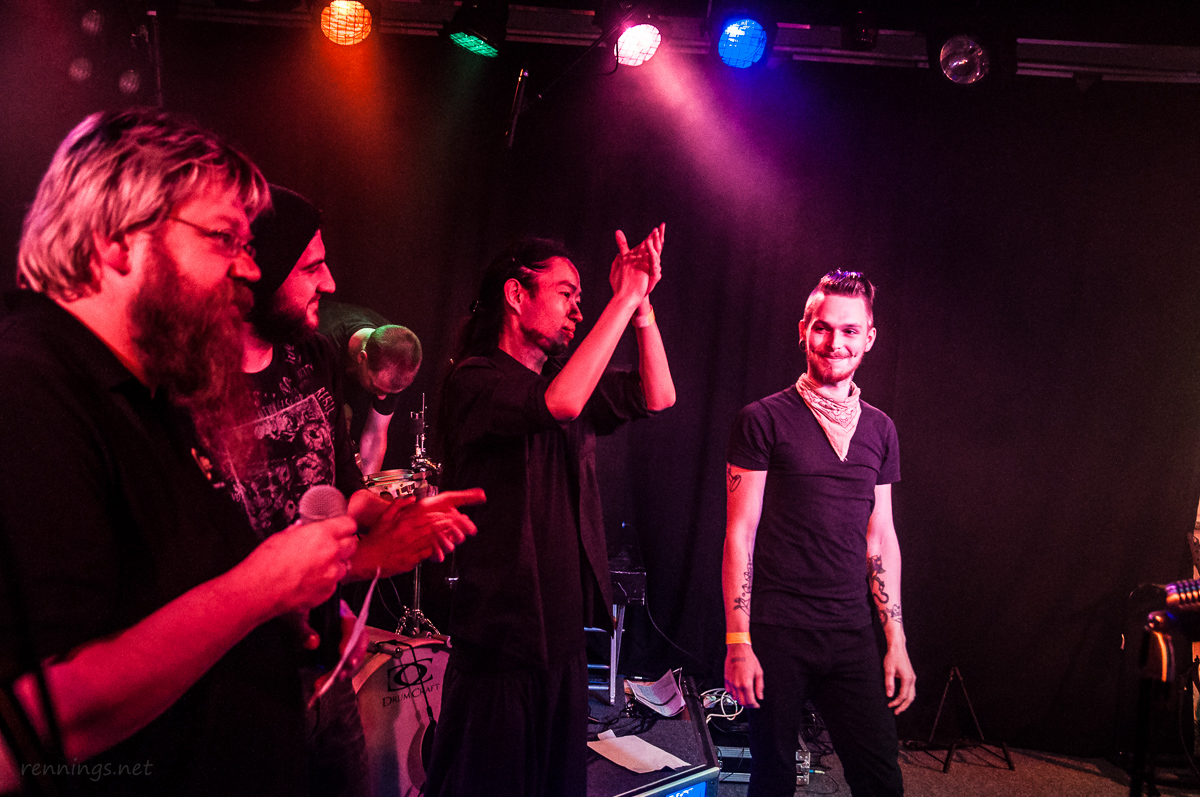 Wäh­rend vor­ne die Show auf dem Höhe­punkt war, wur­den hin­ten die Stim­men aus­ge­zählt, denn der Batt­le brauch­te natür­lich auch einen Gewin­ner: »Some­whe­re Sear­ching« lagen am Ende vor »In Sane« und »Scar­got«. Der größ­te Gewin­ner des Abends war sicher­lich das Publi­kum: Fünf super live acts, mit fet­ter Mucke und gei­ler Par­ty. Wenn ihr die Chan­ce habt, auch nur eine die­ser Bands irgend­wo zu sehen, nutzt sie, geht hin, es lohnt sich.